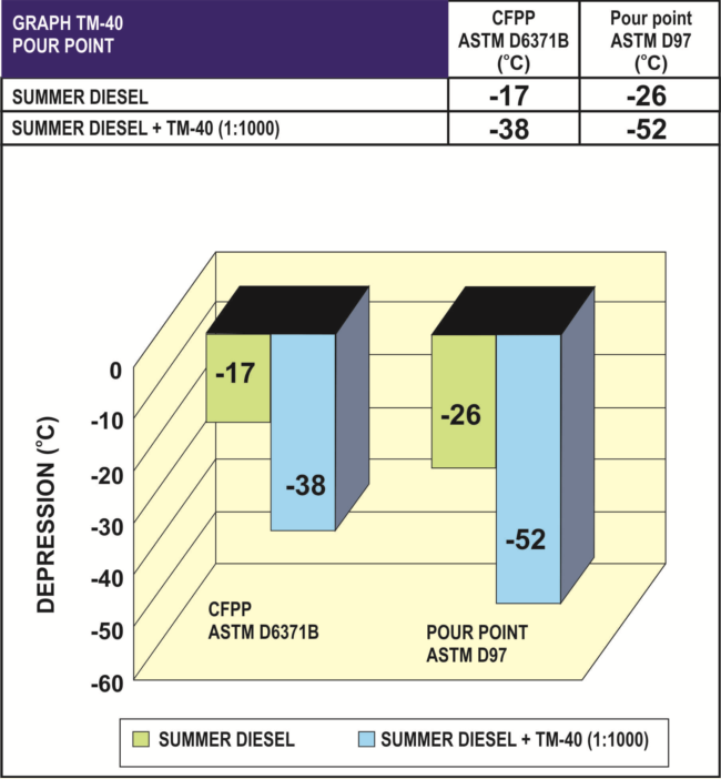 TM-40 is formulated with highest quality ingredients. When used to heating oil or diesel fuel, in which it is completely miscible, it lowers pour point and prevents cold filter plugging. In table and graph below, we show typical performance when TM-40 is added to summer Canadian diesel fuel.